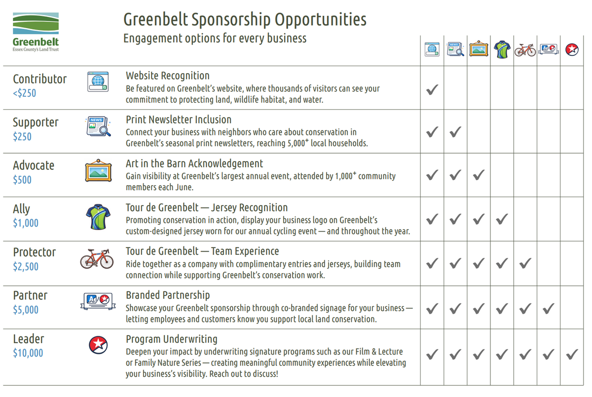 Support Greenbelt’s community work by becoming a partner in conservation. Connect your business and workplace culture to Greenbelt's valued, local work. Your sponsorship shows employees, customers, and neighbors that your business is invested in protecting the land and water that make your community a healthy place to live, work, and belong.