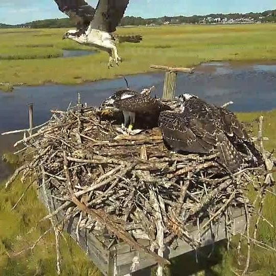 My most recent blog post was not entirely accurate. Today I saw Squam at the nest, as did a few other viewers who brought it to my attention. See the attached photo with squam flying off. It was a very brief visit to deliver a partial fish to one of the fledglings. I still believe the fledglings are catching their own fish because I have seen them with a live fish on the side perch, and I do not think Squam is handing off live fish.