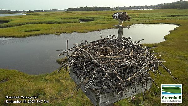 Greetings for perhaps the final time in 2025. It has been about a month since my last blog entry and since then Kate and Ed have left the nest for good, with their last sighting on or about Sep 8. The attached photo shows one of them - 42S yellow color band - on the nest on Sep 6. Who knows where they might be now. Hopefully south of Essex County and safe. They have an arduous journey ahead of them, one only about 40-50% of fledglings make successfully. And even fewer return as 2 year olds after spending 18 months their first time on the wintering grounds. Let's all think positive thoughts for these two. It would be so cool to spot one or both of them in 2027 with their easy to read yellow color bands!