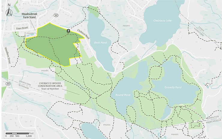 The varied landscape of this property includes mature forestland, dramatic rocky outcrops, vernal pools, and prominent working farmland along both Route 22 (Essex Street) and Chebacco Road. The property connects directly to the trails in Chebacco Woods, a popular year-round destination for outdoor recreation among residents of the region.