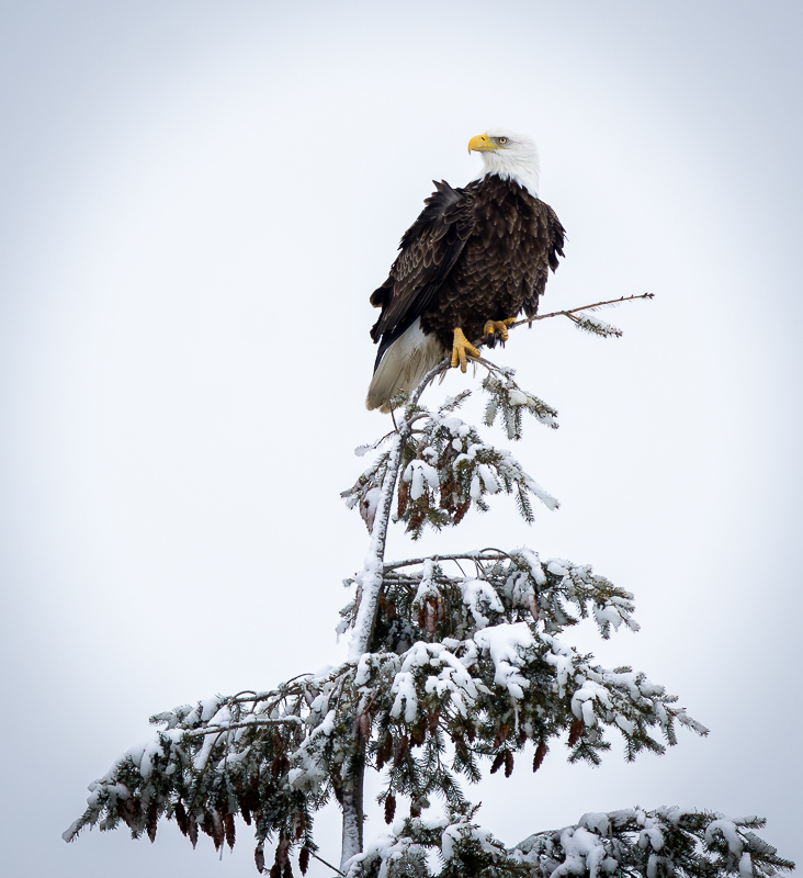 Bald eagles usually inhabit coastal areas, estuaries, and larger inland waters. They require extensive shoreline habitat with nearby forested areas for nesting. Eagles prefer trees that rise above the canopy, providing a clear vantage point for perching and hunting. Waterbodies with a healthy supply of moderate- to large-sized fish are especially attractive.