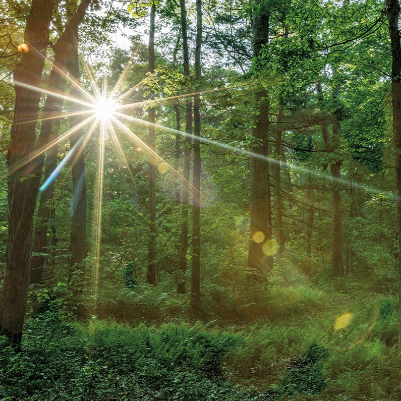 The morning sun shines through the trees in a forest at the Donibristle Reservation in Topsfield, Massachusetts.