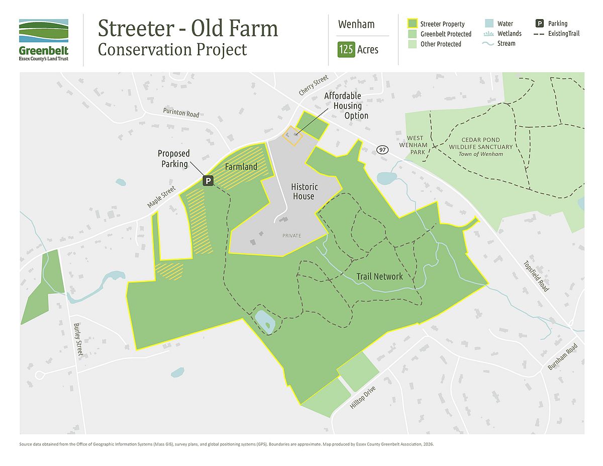 The Streeter property in Wenham, also known as “Old Farm,” comprises 140 acres, including two existing houses. Greenbelt plans to work with Historic New England to protect the 1689 National Register-listed main home and the surrounding 15 acres with a Historic Preservation Restriction before selling it to a private buyer. Additionally, Greenbelt is exploring options to sell the smaller cottage, potentially as an affordable housing opportunity for the community.